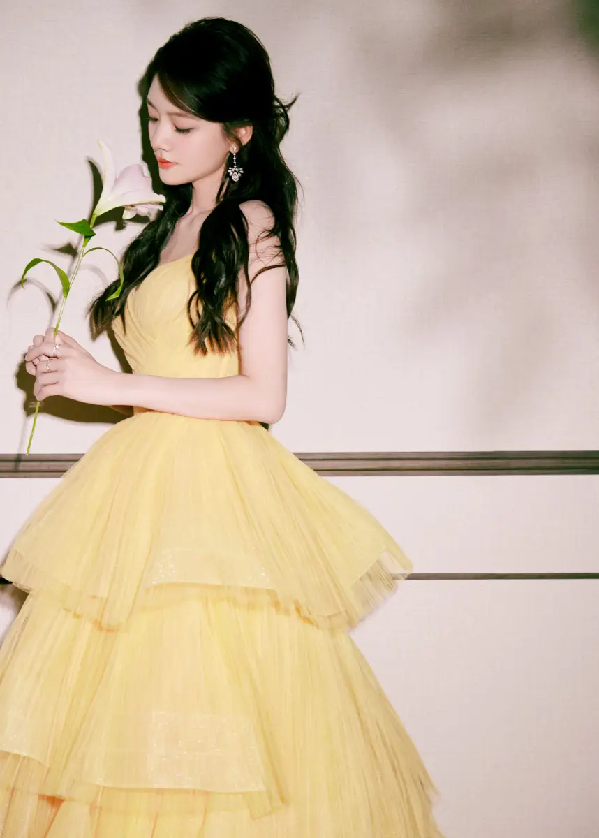 任敏穿黃色抹胸裙甜美動(dòng)人 手捧鮮花盡顯少女情懷