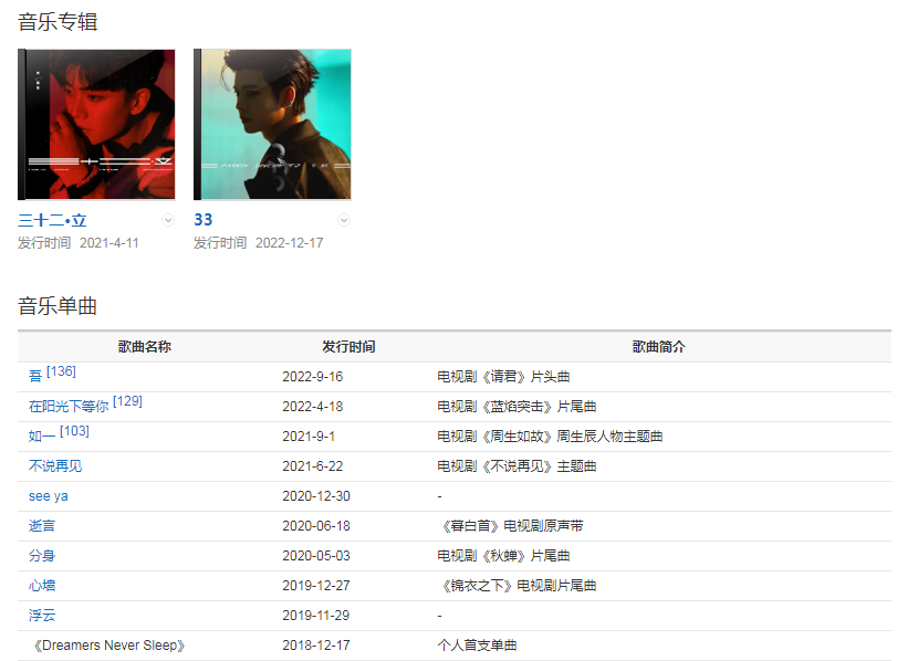 2021年在央視春節(jié)聯(lián)歡晚會(huì)表演小品《每逢佳節(jié)被催婚》。同年主演古裝劇《馭鮫記之與君初相識(shí)》。4月11日發(fā)行第一張個(gè)人專輯《三十二·立》,上線五分鐘銷量突破50萬,創(chuàng)QQ音樂“鉆石唱片”記錄。