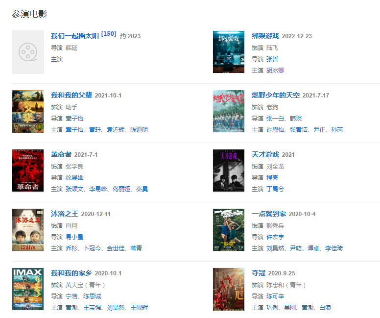 代表作品:快把我哥帶走、風(fēng)犬少年的天空、大象席地而坐、奮斗吧,少年!、閃光少女、都挺好、奪冠、一點(diǎn)就到家、刺客列傳