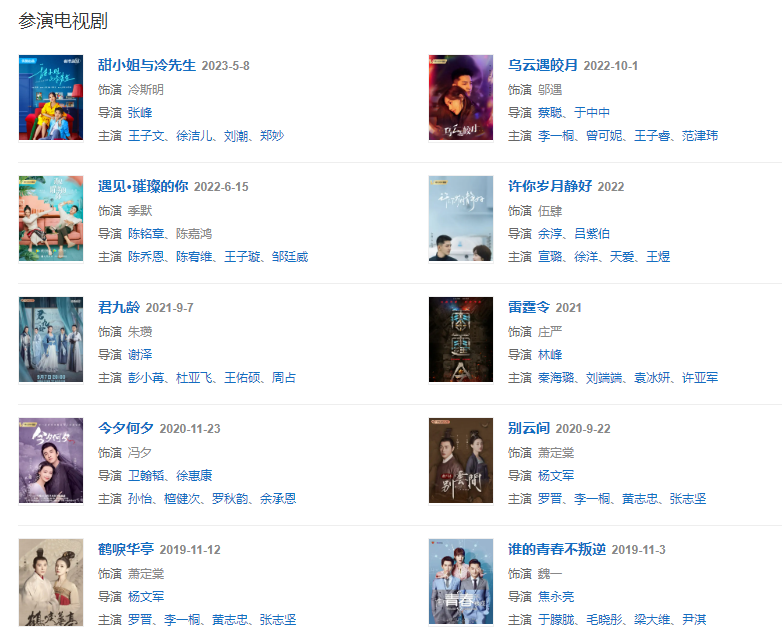 2019113日主演的青春熱血都市劇《誰的青春不叛逆》在芒果TV播出;1112日,主演的古裝劇《鶴唳華亭》在優(yōu)酷播出。