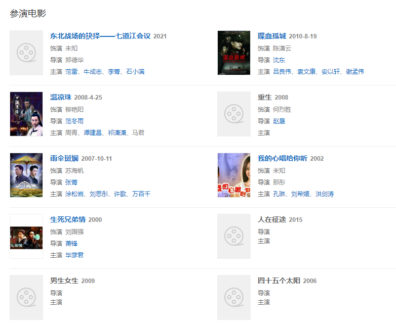 2000年,參演故事片《生死兄弟情》,飾演邊緣人物劉國強(qiáng)一角而獲得第18屆金鷹獎最佳男演員提名。