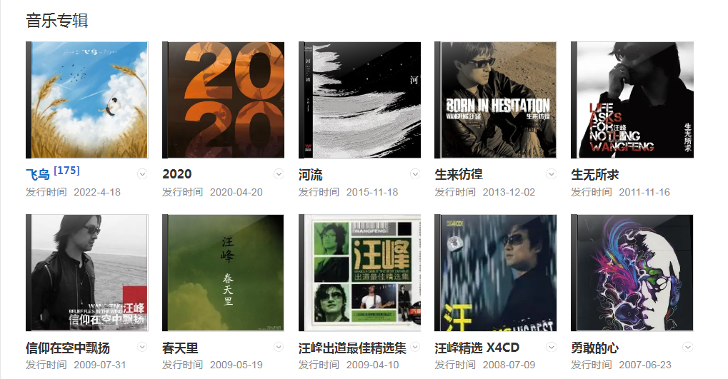 代表作品:花火、存在、怒放的生命、飛得更高、勇敢的心、一起搖擺、在雨中、春天里、像夢一樣自由、北京北京、滿、光明、河流、無處安放、愛是一顆幸福的子彈、生來彷徨、再見青春、美麗世界的孤兒、你是我心愛的姑娘、我愛你中國、我如此愛你