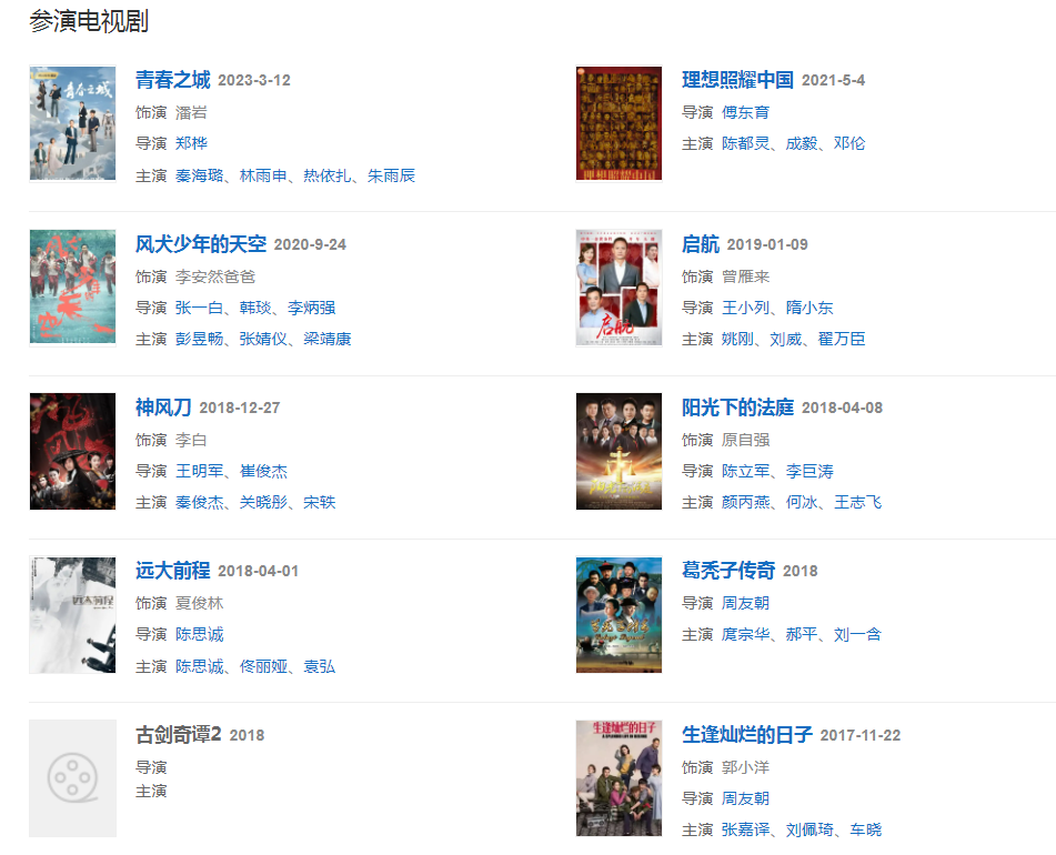 代表作品:與青春有關(guān)的日子、袁隆平、新亮劍、狗十三、生活啟示錄、國(guó)家底線、生逢?duì)N爛的日子