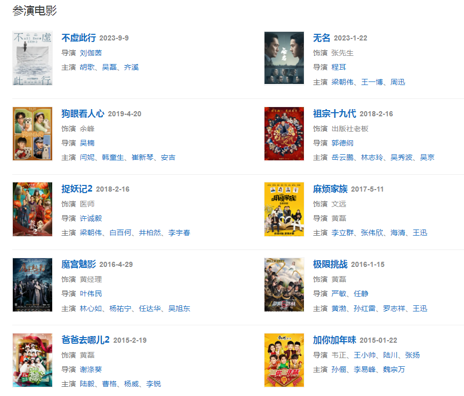 2015年主演都市情感劇《嘿,老頭!》 ,同年參與戶外競(jìng)技類綜藝節(jié)目《極限挑戰(zhàn)》。