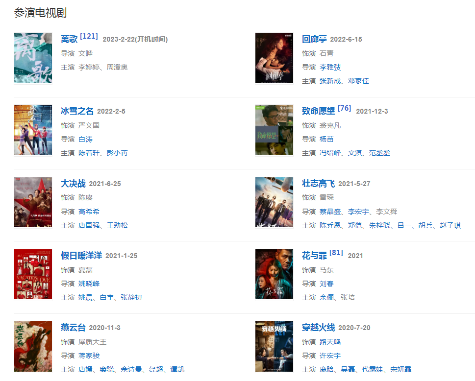 2021年5月27,參演電視劇《壯志高飛》播出;6月25日,主演的重大革命歷史題材電視劇《大決戰(zhàn)》在中央電視臺綜合頻道播出 。11月3日,出演現(xiàn)實懸疑劇《致命愿望》在愛奇藝播出; 參演電視劇《花與罪》。