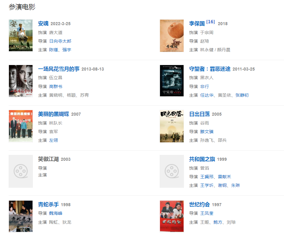 代表作品:黃河謠、情滿珠江、笑傲江湖、地下地上、鐵梨花、光榮大地、大戲法、打狗棍、一代梟雄