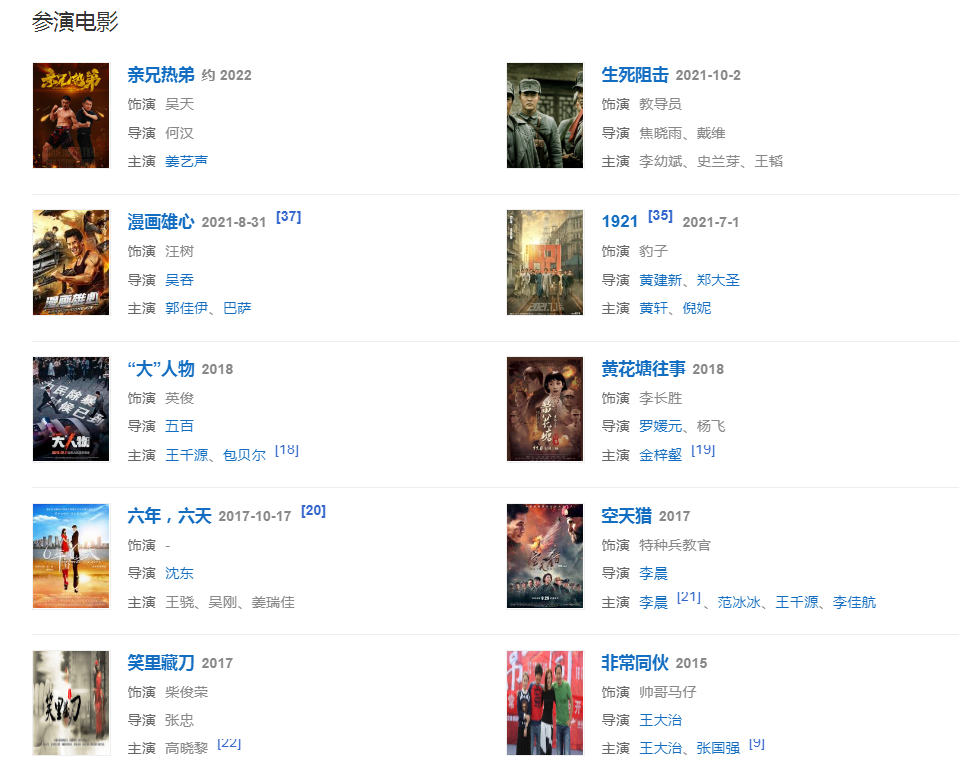 2021年5月25日,出演的重大革命歷史題材劇《光榮與夢想》在北京衛(wèi)視、東方衛(wèi)視及騰訊視頻、愛奇藝、優(yōu)酷同步播出 ;同年,參演黃建新、鄭大圣執(zhí)導的電影歷史劇《1921》,在劇中飾演豹子 ;8月31日,主演軍事動作槍戰(zhàn)電影《漫畫雄心》在騰訊視頻播出,在片中飾演汪樹;10月2日,出演的抗戰(zhàn)電影《生死阻擊》在愛奇藝上線 。11月,參與由《反貪風暴》系列導演林德祿執(zhí)導的緝毒題材動作大片《隱秘世界》正式殺青。