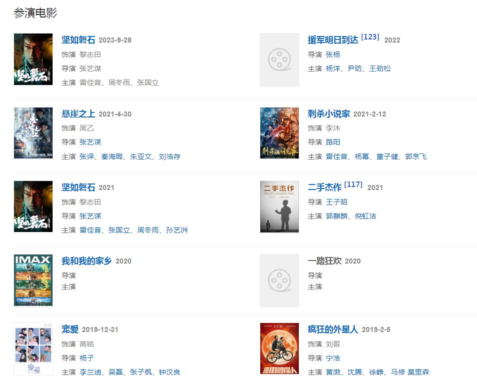 代表作品:懸崖之上、三國(guó)、大軍師司馬懿之軍師聯(lián)盟、獵毒人、刑警隊(duì)長(zhǎng)、決勝法庭、巡回檢察組、刺殺小說(shuō)家、覺(jué)醒年代、建軍大業(yè)、中國(guó)1921、大決戰(zhàn)、我不是潘金蓮、下一站婚姻、理想之城、青盲