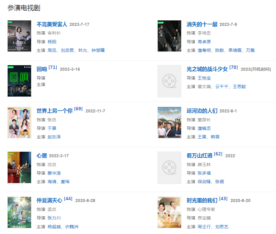代表作品:人民的名義、北京愛(ài)情故事、無(wú)懈可擊之高手如林、老大的幸福、青河絕戀