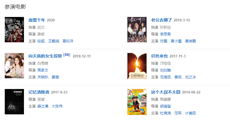 代表作品:妻子的謊言、我的奇妙男友、花樣江湖、真正男子漢第二季