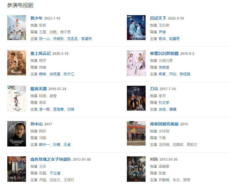 代表作品:我在天堂等你、幸福里九號、倚天屠龍記、小站風云、血色玫瑰之女子特遣隊、青春因愛而美麗