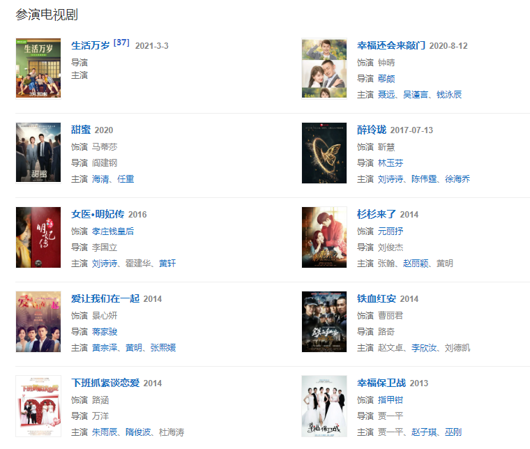 代表作品:我愛的是你愛我、鐵血紅安、杉杉來了、女醫(yī)·明妃傳