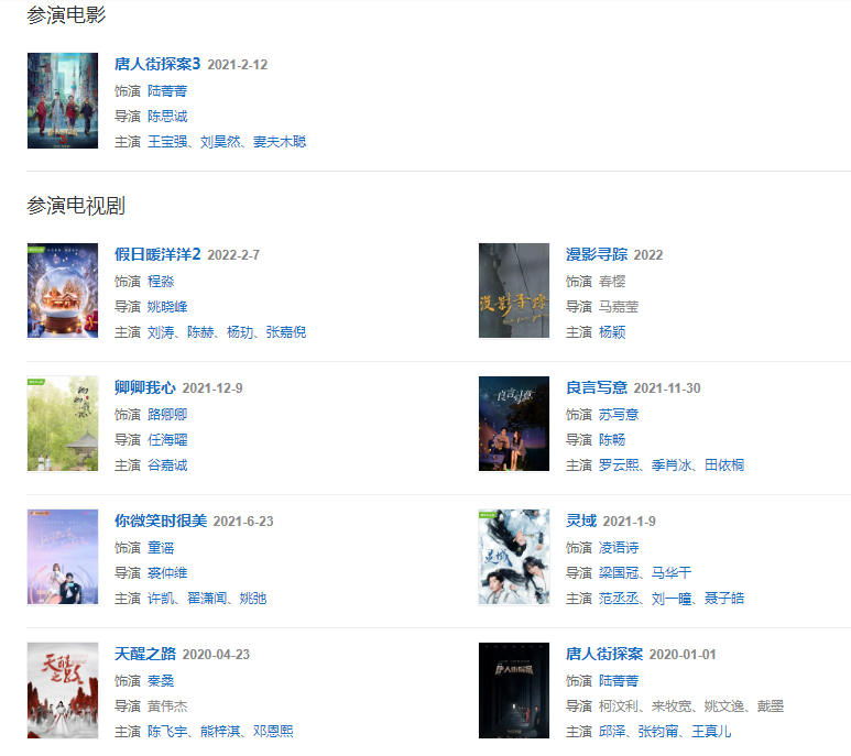 代表作品:天醒之路、你微笑時很美、少年之名、若情、唐人街探案、極限青春