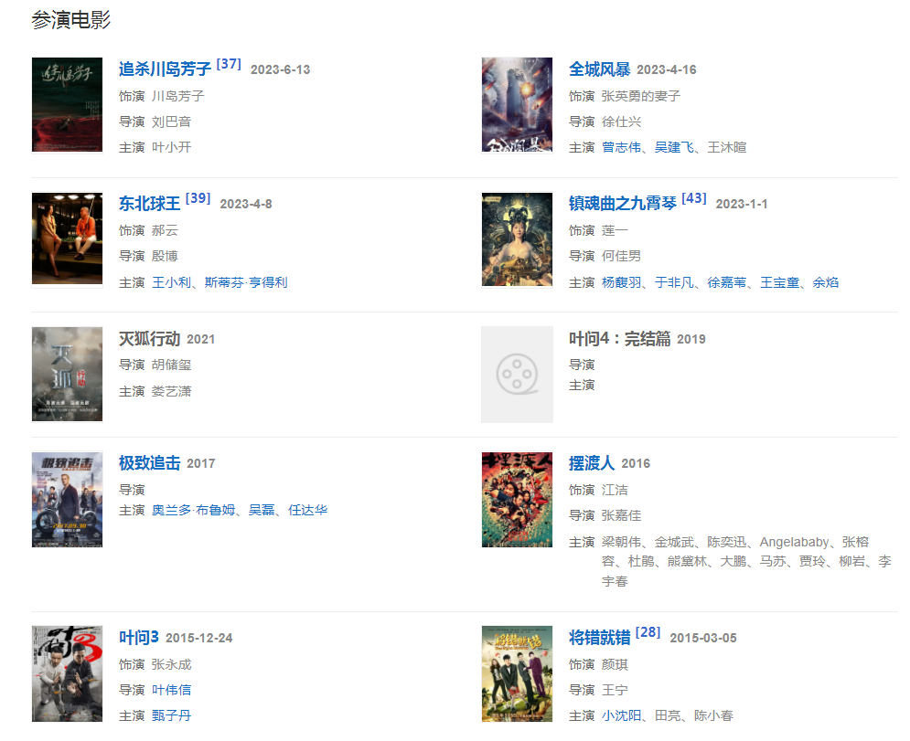 代表作品:葉問、我的野蠻女友2、拜金女王、擺渡人
