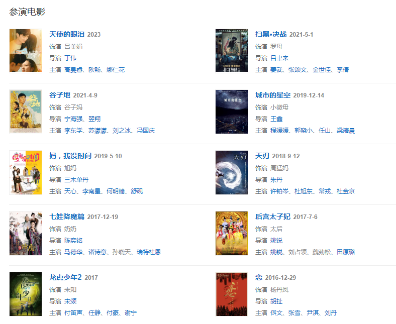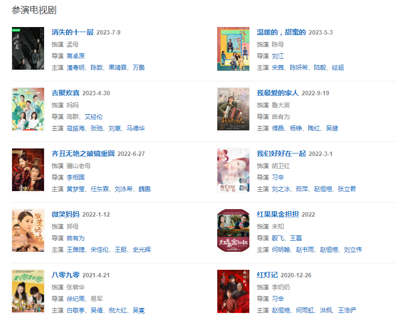 代表作品《過年》、《幸福像花兒一樣》、《岳母的幸福生活》、非親姐妹