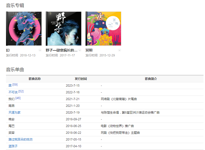 2017年,推出個人翻唱單曲《路過我耳朵的憂傷》 ;同年,她還為動畫電影《藍精靈:尋找神秘村》演唱了中國區(qū)推廣曲《藍孩子》 。