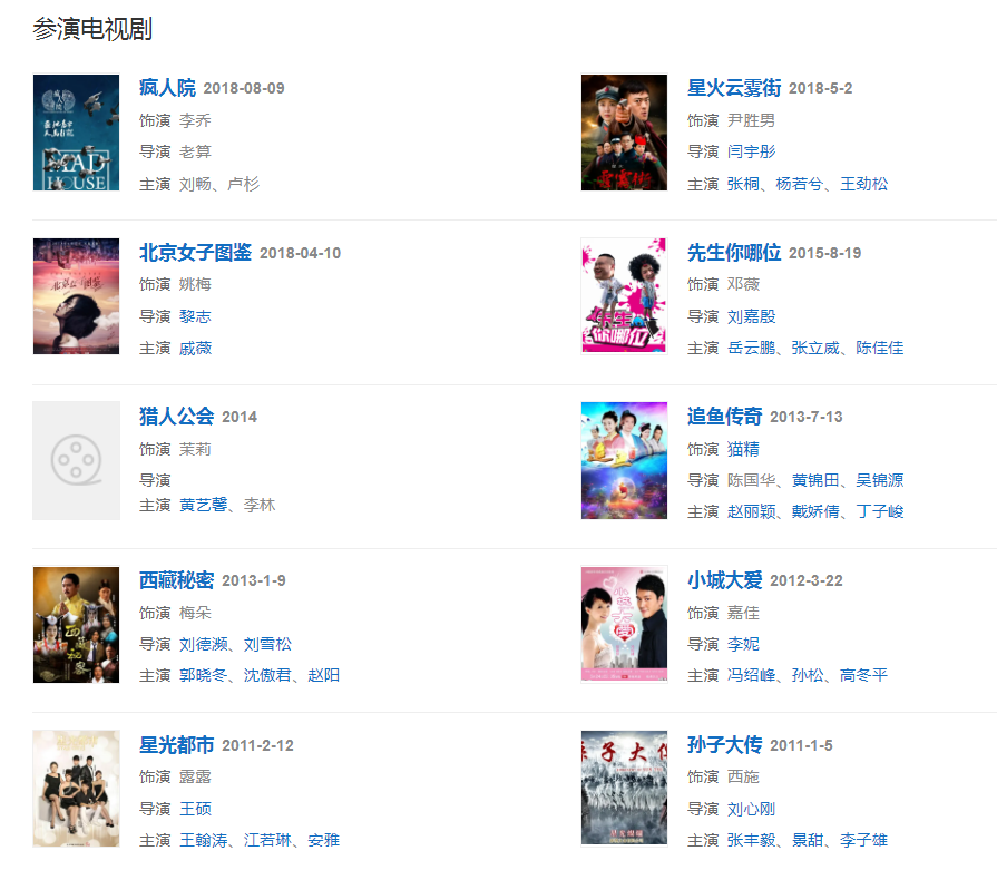 代表作品:前任攻略、我們的十年、脫軌時(shí)代、軒轅大帝、小城大愛、西藏秘密、瘋?cè)嗽骸⒈本┡訄D鑒