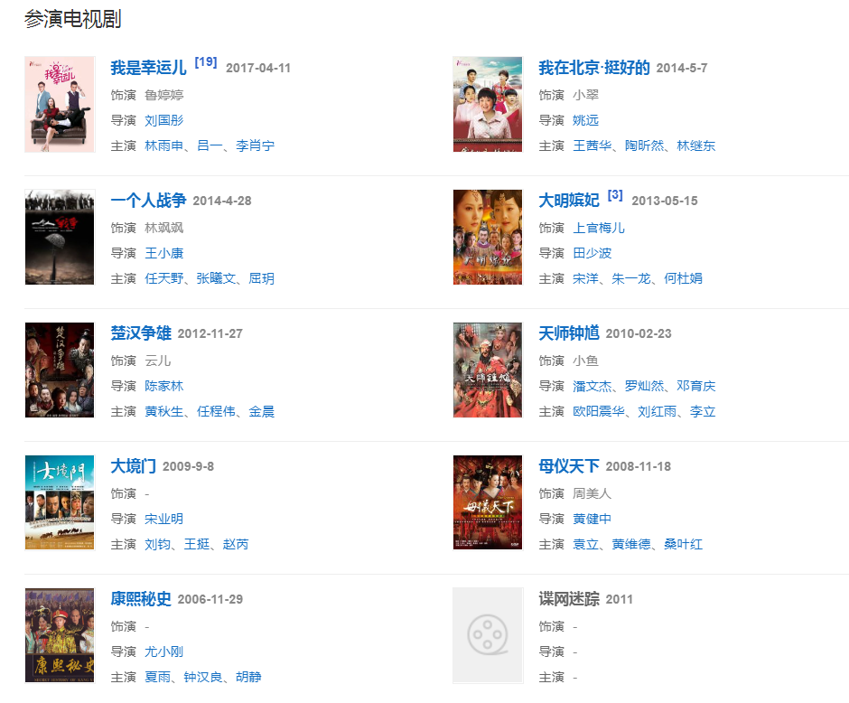 代表作品:大明嬪妃、天師鐘馗、楚漢爭雄、母儀天下粉絲名卿花瓷喜歡書籍《穆斯林的葬禮》、《長恨歌》