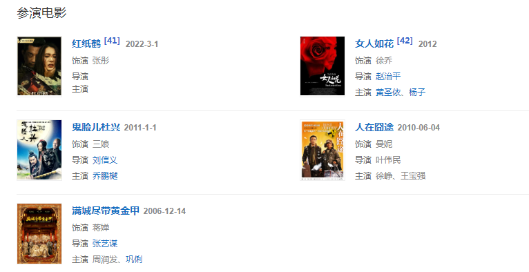 2006年,出演張藝謀執(zhí)導(dǎo)的古裝片《滿城盡帶黃金甲》,憑借該片提名金雞百花電影節(jié)最佳新人獎(jiǎng),獲得“賀歲十年歡樂(lè)盛典”最受歡迎電影女配角獎(jiǎng)。