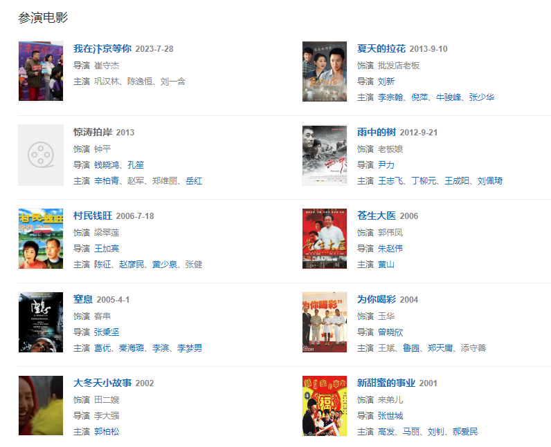 代表作品:當(dāng)家的女人、闖關(guān)東2、胡楊女人、小麥進(jìn)城、黨的女兒、女人的村莊、我在北京·挺好的、小草青青、關(guān)中女人