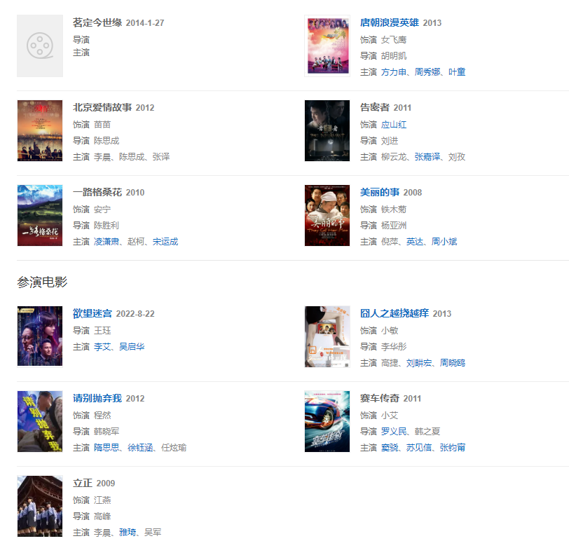 代表作品:一路格桑花、告密者、賽車傳奇、唐朝浪漫英雄、囧人之越撓越癢