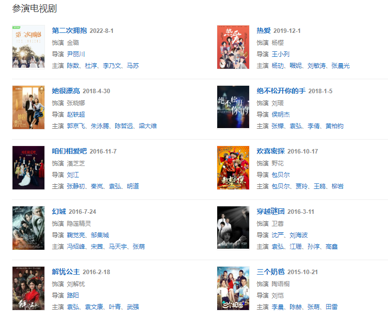 2014年憑借年代劇《大河兒女》獲得國劇盛典年度觀眾最喜愛劇中角色女演員獎 2016年11月,主演的都市情感劇《咱們相愛吧》播出。