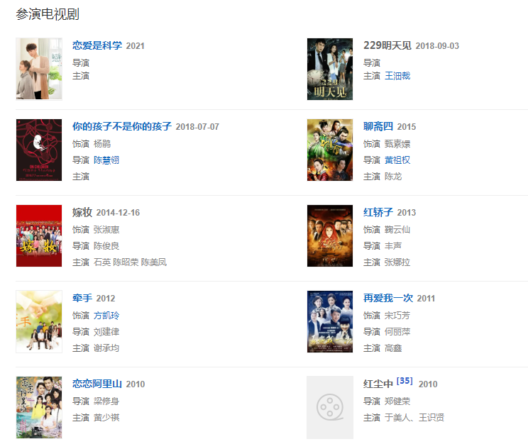 2014年,主演豐聲執(zhí)導(dǎo)的劇情類電視劇《紅轎子》,在劇中飾演苦情女鞠云仙,該劇講述了民國(guó)初年“吉端”轎館當(dāng)家人喬玉竹典轎夫之妻云仙為妾而引發(fā)的一系列家族恩怨、亂世情緣、國(guó)仇家恨、間諜暗戰(zhàn)的故事。同年,主演陳俊良執(zhí)導(dǎo)的的家庭劇情類電視劇《嫁妝》。