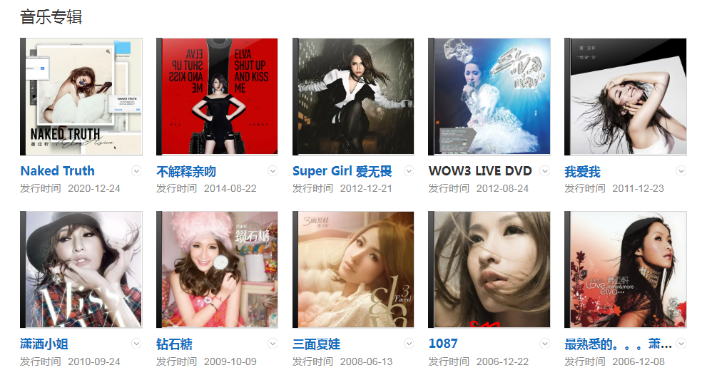 代表作品:最熟悉的陌生人、愛(ài)的主打歌、瀟灑小姐、類(lèi)似愛(ài)情、錯(cuò)的人、表白、突然想起你、一個(gè)人的精彩、當(dāng)你和心跳一起出現(xiàn)、倒數(shù)、我愛(ài)你那么多、窗外的天氣、Naked Truth