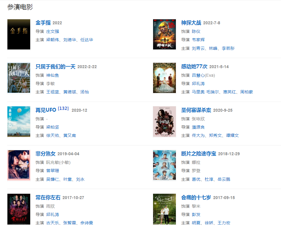2021年,將參演莊文強(qiáng)新作《金手指》。5月14日,主演愛情電影《感動(dòng)她77次》,飾演職場(chǎng)女孩Eva。