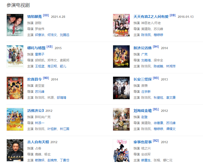 2014年搭檔陳浩民、陳威翰拍攝古裝神話魔幻劇《新濟公活佛》,飾演廣亮。因心臟不好,現(xiàn)場突然暈倒送醫(yī)急診。同年再次與陳浩民合作在上海拍攝古裝喜劇《歡喜縣令》,飾演麥亞堂一角。同年,出演電視劇《天天有喜2之人間有愛》,在劇中飾演神醫(yī)老人/月老。