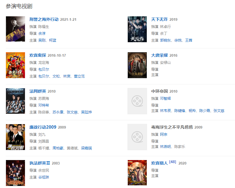 2004年與李修賢、盧惠光等演員出演《黑白江湖》,林雪在影片中飾演黑社會老大。2005年10月18日與古天樂、邵美琪、張家輝等主演出席電影《黑社會》(內(nèi)地譯名《龍城歲月》)舉行的首映禮。