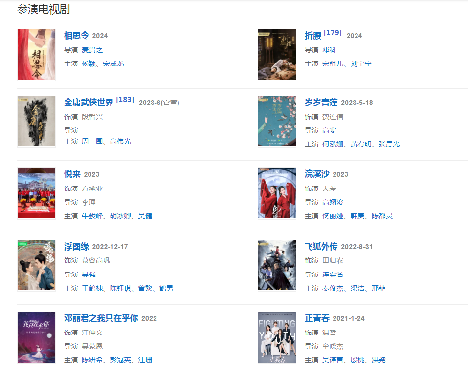代表作品:風(fēng)云、一米陽光、玉觀音、三國、楚漢傳奇、臥虎藏龍、泡沫之夏、那年花開月正圓、三少爺?shù)膭?、我記得我愛過、沒有我你怎么辦、好想對你說、梁山伯與祝英臺、花謝花飛花滿天、馬上天下、美麗的秘密
