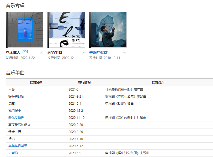 2020年6月,以唱作人的身份參與愛奇藝唱作人生態(tài)挑戰(zhàn)節(jié)目《我是唱作人第二季》 ;7月6日,為電視劇《怪你過分美麗》演唱的主題曲《去愛你》正式上線。