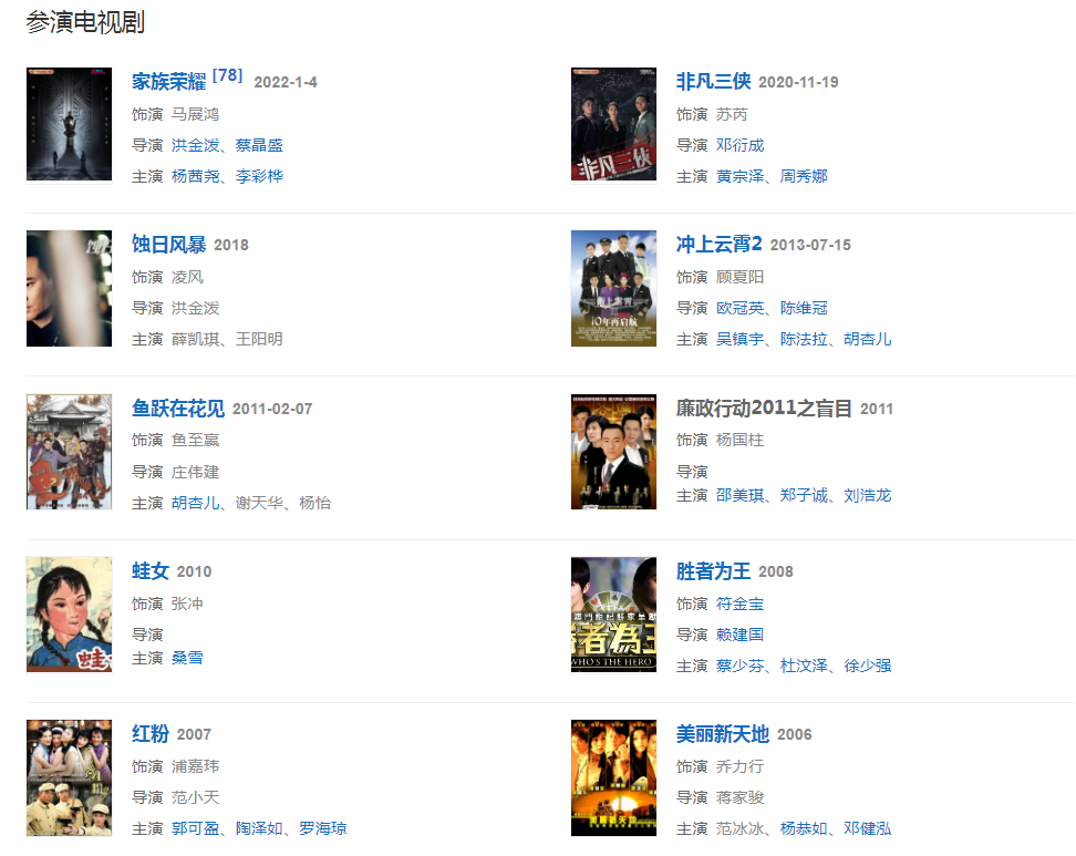 代表作品:現(xiàn)代愛情故事、祝君好、十指緊扣、片片楓葉情、天地男兒、澳門街、陸小鳳傳奇、沖上云霄2