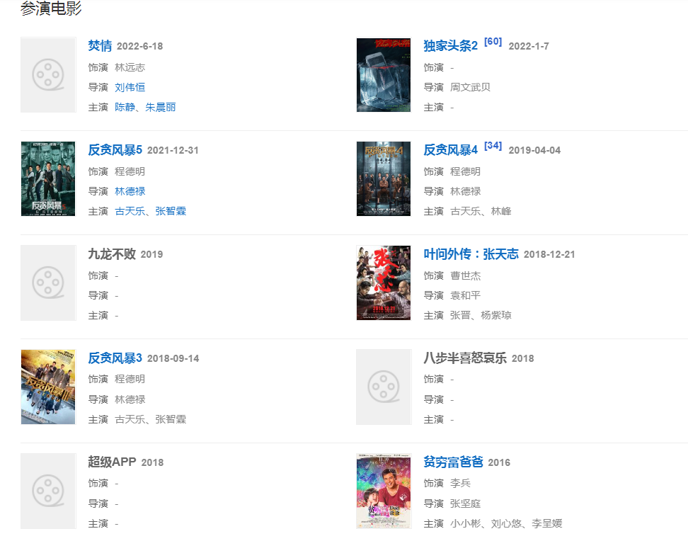 代表作品:天幕下的戀人、與敵同行、烈火雄心3、怒火街頭、步步驚心、僵